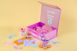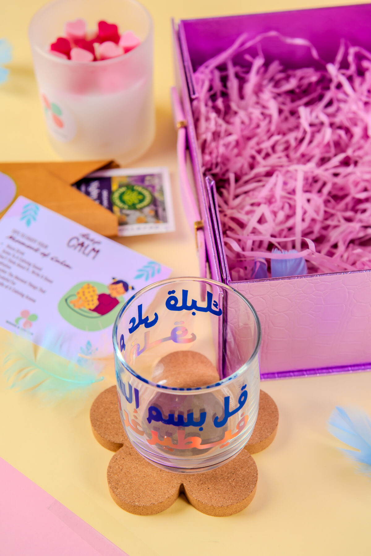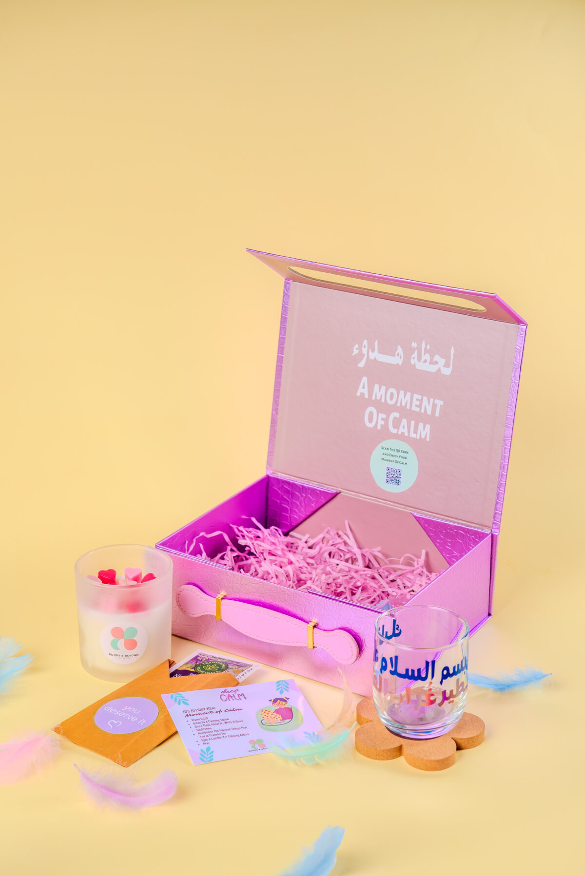 Box containing a candle with a relaxing and refreshing rose scent, a teacup, herbal tea bags that aid relaxation and sleep, a cup holder, a relaxation music player, and Parkwood relaxation music.