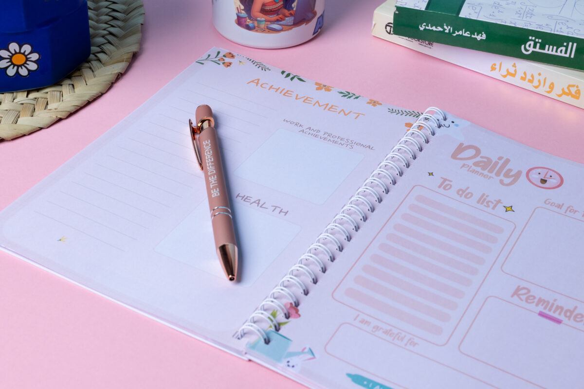 مخطط يحتوي على صفحات لكتابة الأعمال اليومية ،الامتنان ، كتابة الانجازات ،الاهداف ,مع توكيدات إيجابية في كل صفحة